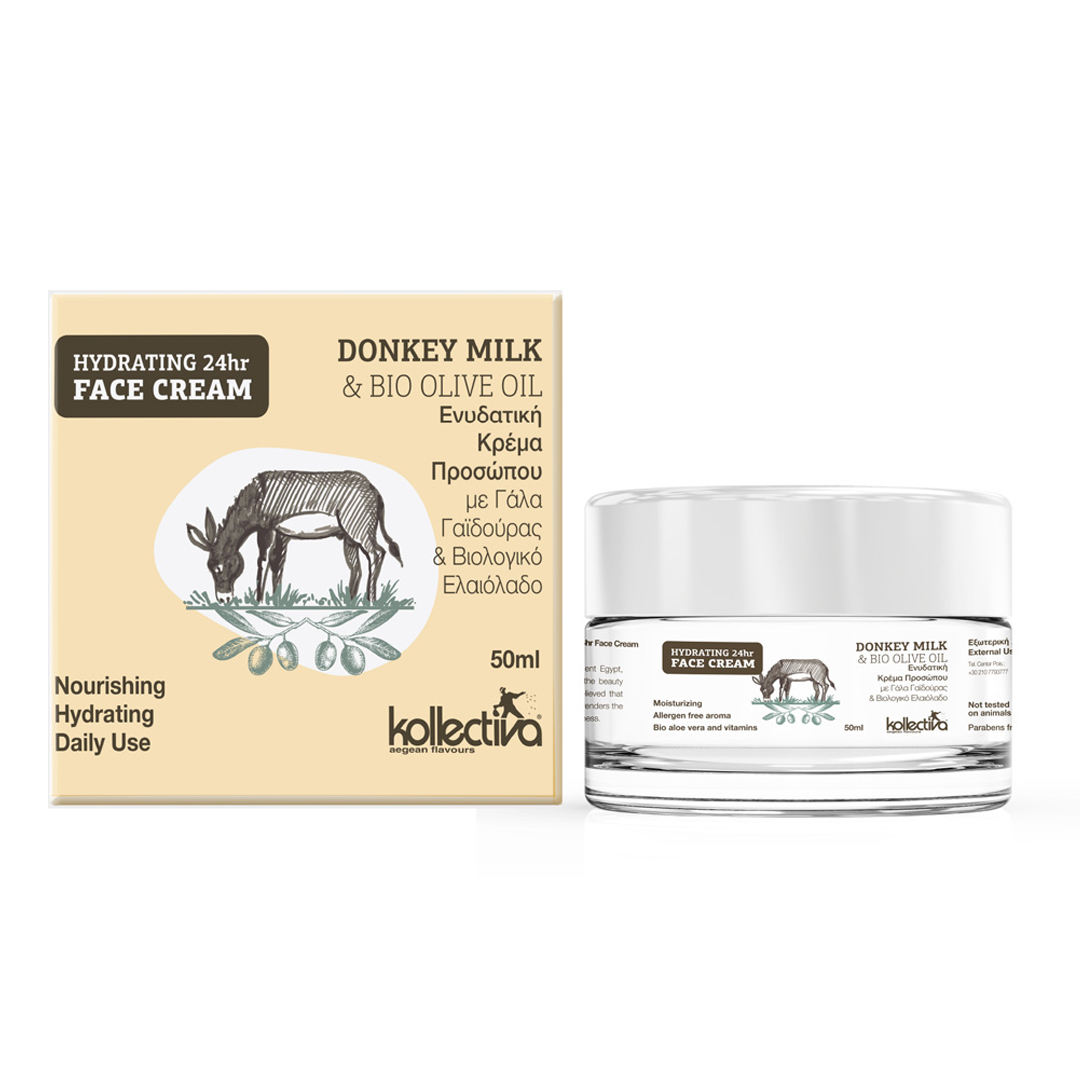 Η 24ωρη κρέμα προσώπου με γάλα γαϊδούρας έχει ενυδατική δράση και θρεπτικές ιδιότητες. Συνιστάται επίσης για να αποτρέψει την ξηρότητα του δέρματος, τη δράση του χρόνου στο δέρμα και την αποκατάσταση των ζημιών από τον ήλιο.