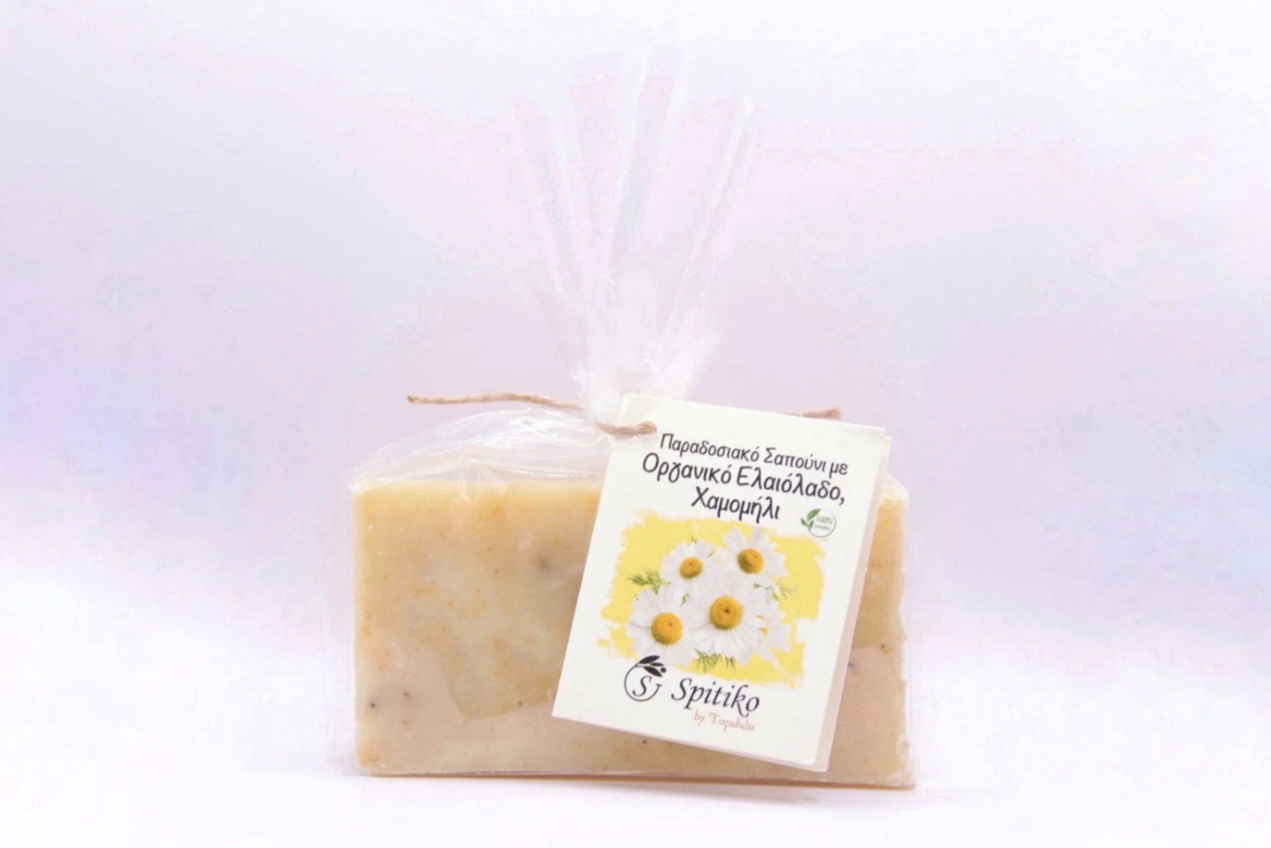 Βιολογικό, vegan σαπούνι με κρεμώδη αφρό, πλούσιο σε βιταμίνες A, C, E. Το σαπούνι με χαμομήλι έχει ως βάση του βραβευμένο Ελληνικό Οργανικό ελαιόλαδο, βότανα, εκχυλίσματα, πρώτες ύλες Α’ ποιότητας και αγνά υλικά που μας προσφέρει η φύση! Είναι δερματολογικά ελεγμένο, ενώ δεν περιέχει χημικά, συντηρητικά και αφριστικά (Crueltyfree, Parabens free).